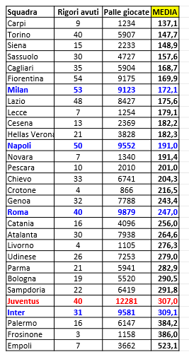 Interessante statistica sui rigori assegnati, pubblicata in settimana da Calcio&Finanza e messa in relazione alle palle giocate in area di rigore, tanto per fugare un altro Luogo Comune Maledetto per cui “l‘Inter riceve pochi rigori a favore perchè in area di rigore ci va poco e tira tanto da fuori area“.
